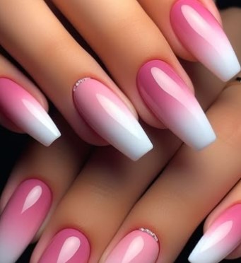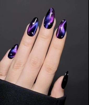 Dreamy gradients with cosmic shimmer—such as deep purple fading into electric pink—bring futuristic energy to nails with a pop of sparkle.